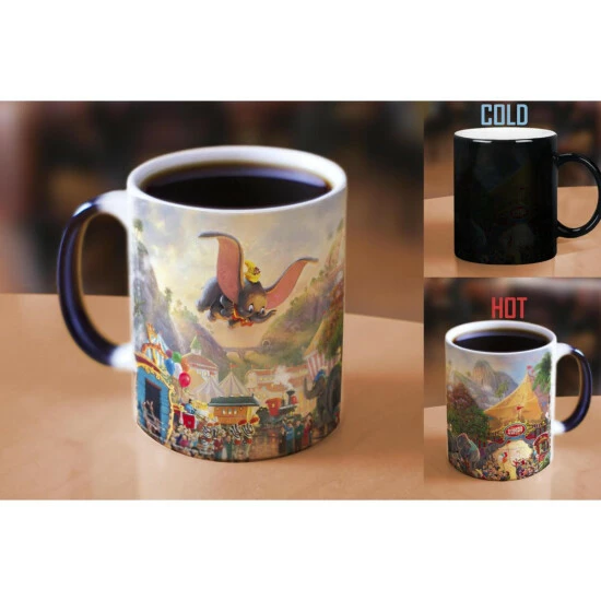 This collectible heat-sensitive mug from Morphing Mugs transforms from black as hot liquid is added. Watch as the heat-activated process reveals the hidden Disney image by artist Thomas Kinkadein full vivid colors.